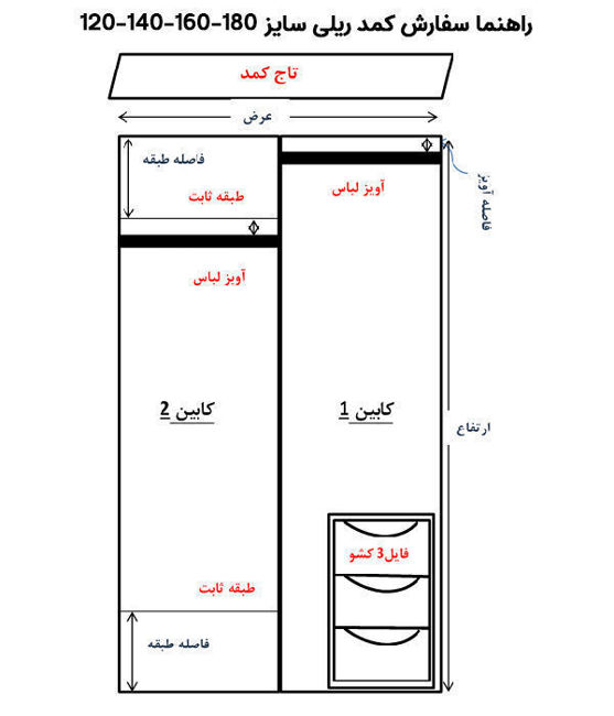 نقشه نمونه کمد ریلی را می‌توانید از اسلاید آخر عکس‌های محصول مشاهده کنید. برای مشاهده مدل‌های متنوع‌تر و اطلاعات بیش‌تر می‌توانید به صفحه کمد مراجعه کنید.